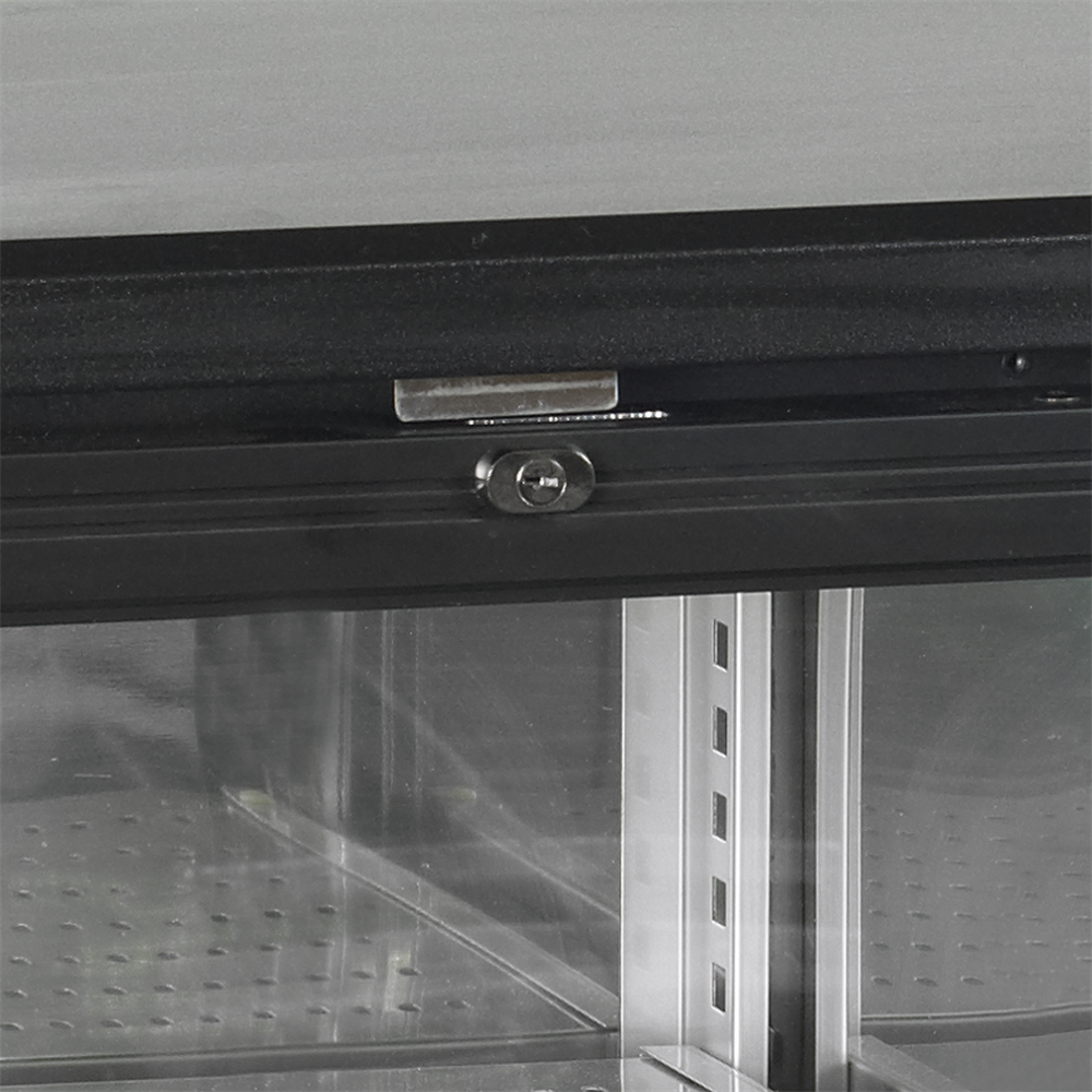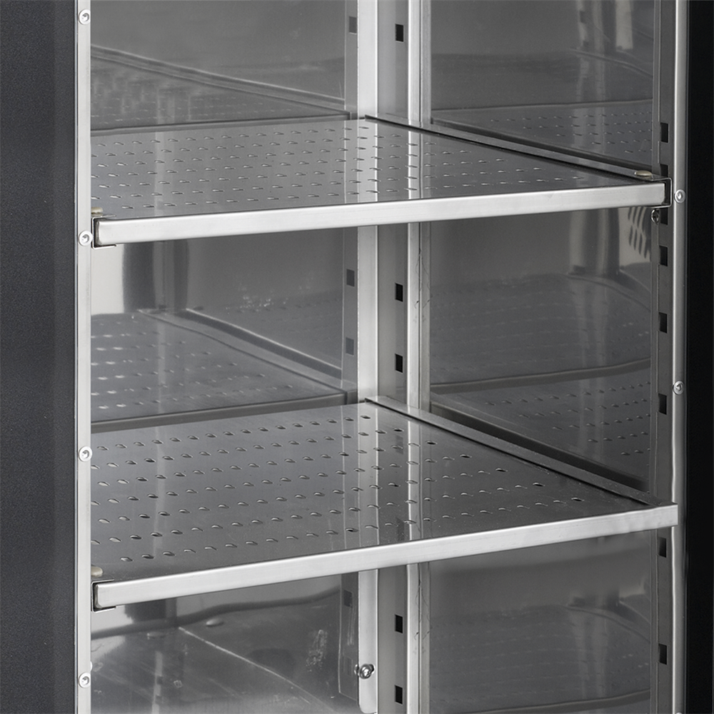 Robust och tålig utrustning|Självstängande glasdörrar|Spegeleffekt rostfritt stål interiör|Ställbara hyllor i stål SS304|Ställbara fötter|Ventilerad kylning