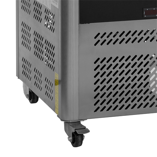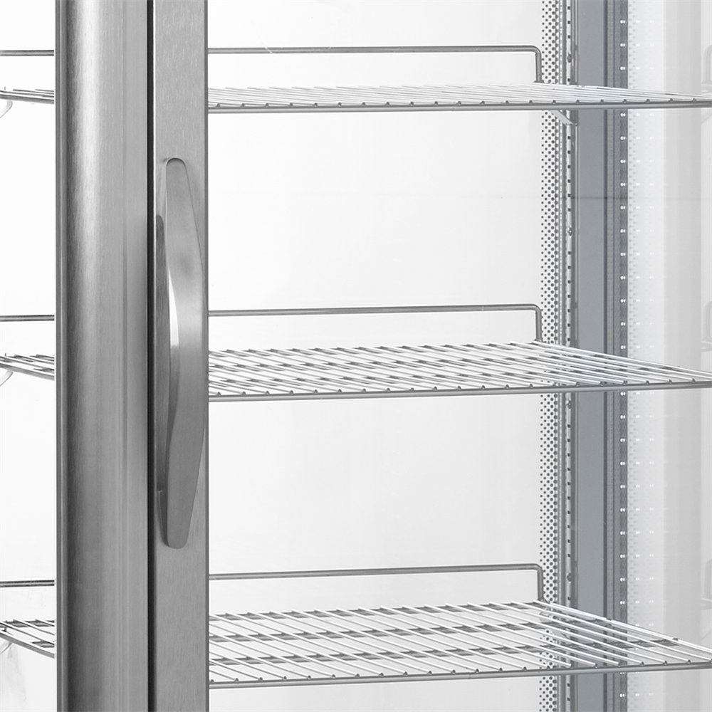 Dubbelglas på fyra sidor|Ställbara näthyllor|Glasdörr|Aluminiumutförande|Kraftiga hjul för rörlighet|Ventilerad kylning|Invändig LED-lampa