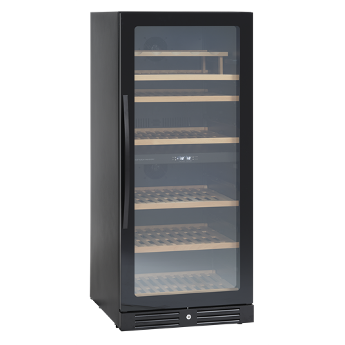 SV 104 B kan användas som ett inbyggt eller fristående vinskåp. Skåpet har två zoner som kan ställas in mellan 5°C - 18°C oberoende av varandra. Skåpet rymmer 90 flaskor på 6 1/2 hyllor i bokträ, varav 5 1/2 utdragbara hyllor och 1 stationär. Ett vackert skåp för förvaring av dina flaskor.