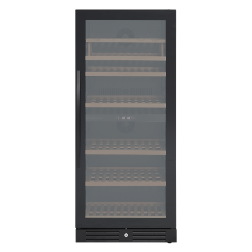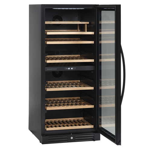 Skåpet har en tidlös design, där den svarta ramlösa glasdörren och innerbelysningen ger skåpet ett exklusivt utseende. Högerhängd dörr med möjlighet till dörrvändning, så det är alltid flexibelt att placera vinskåpet i rummet.