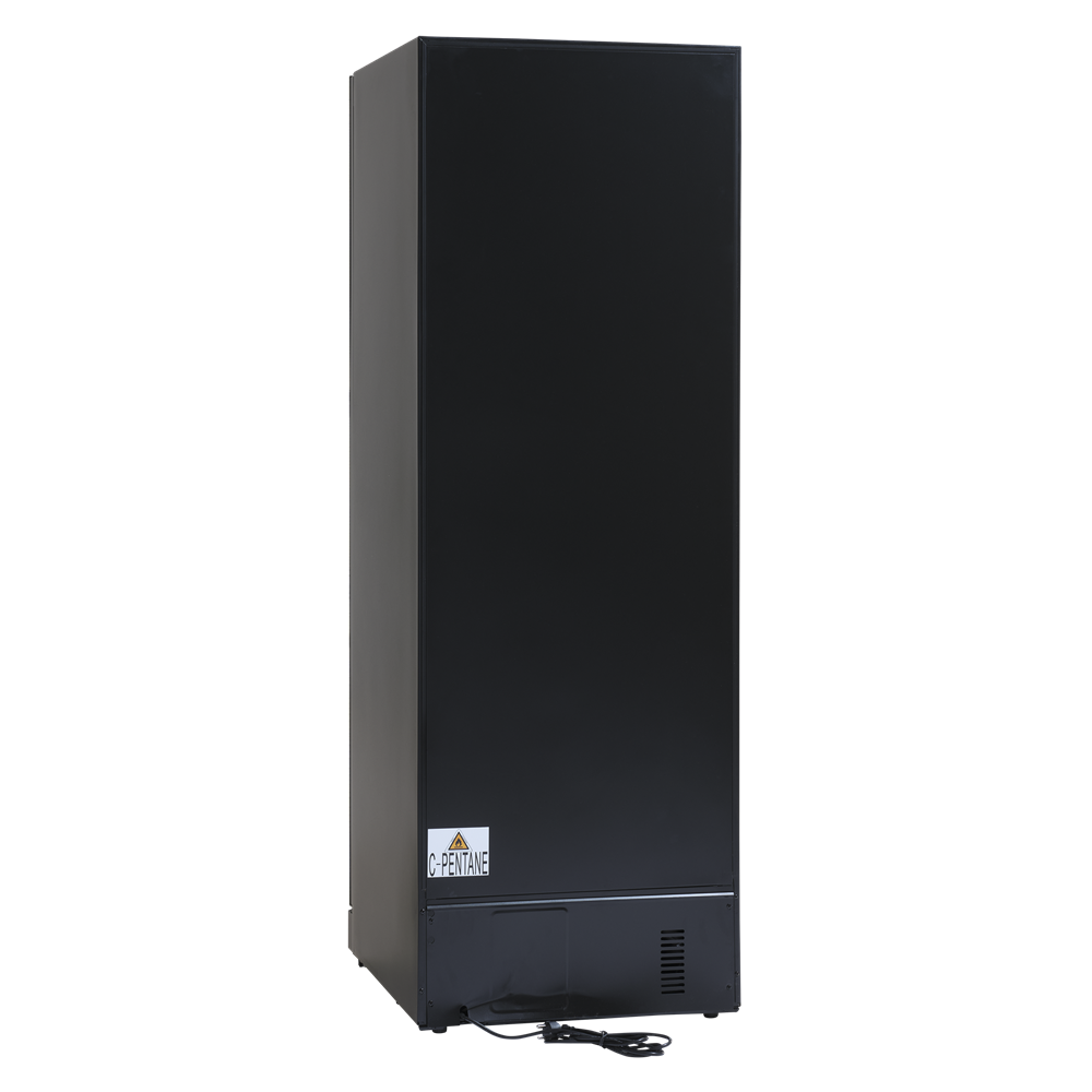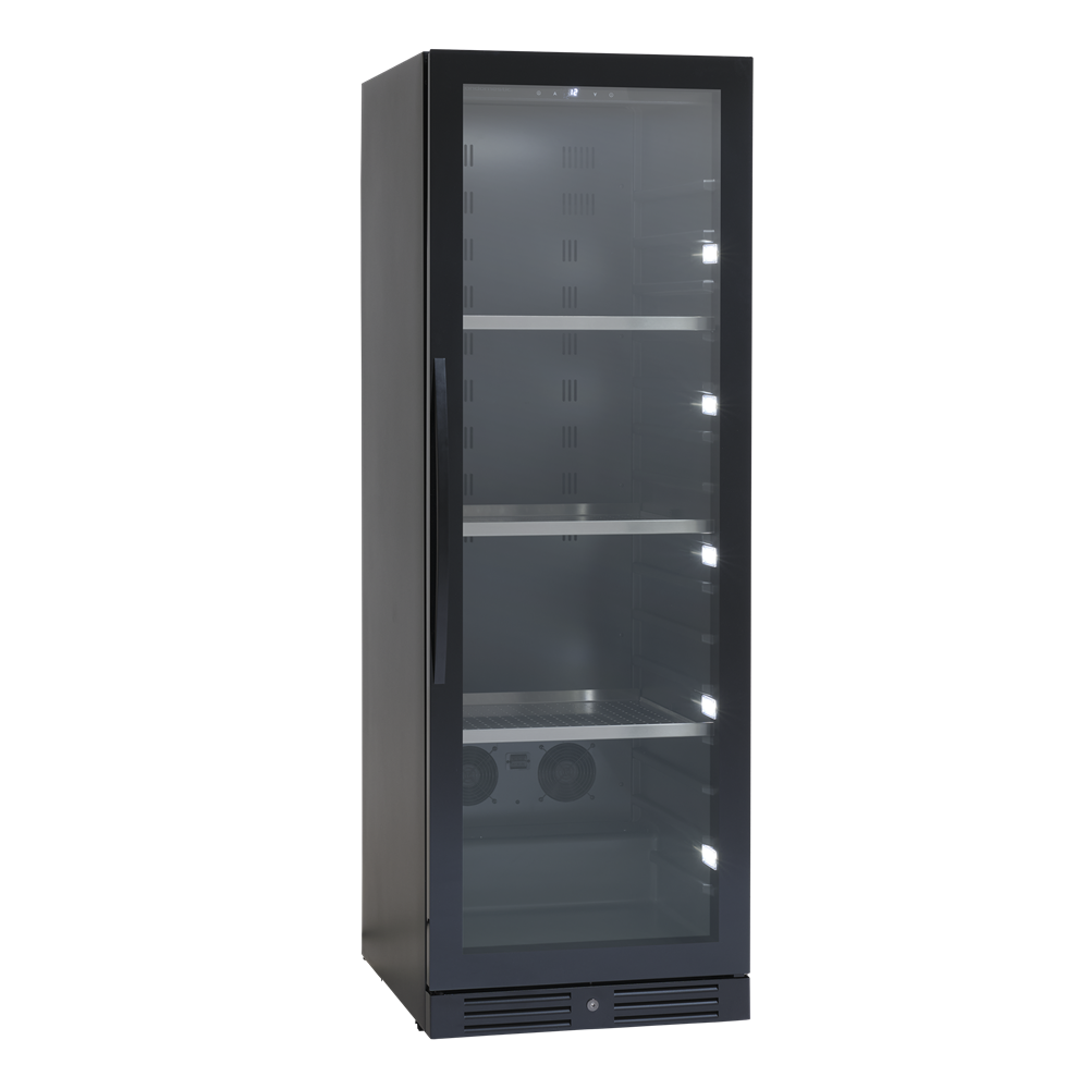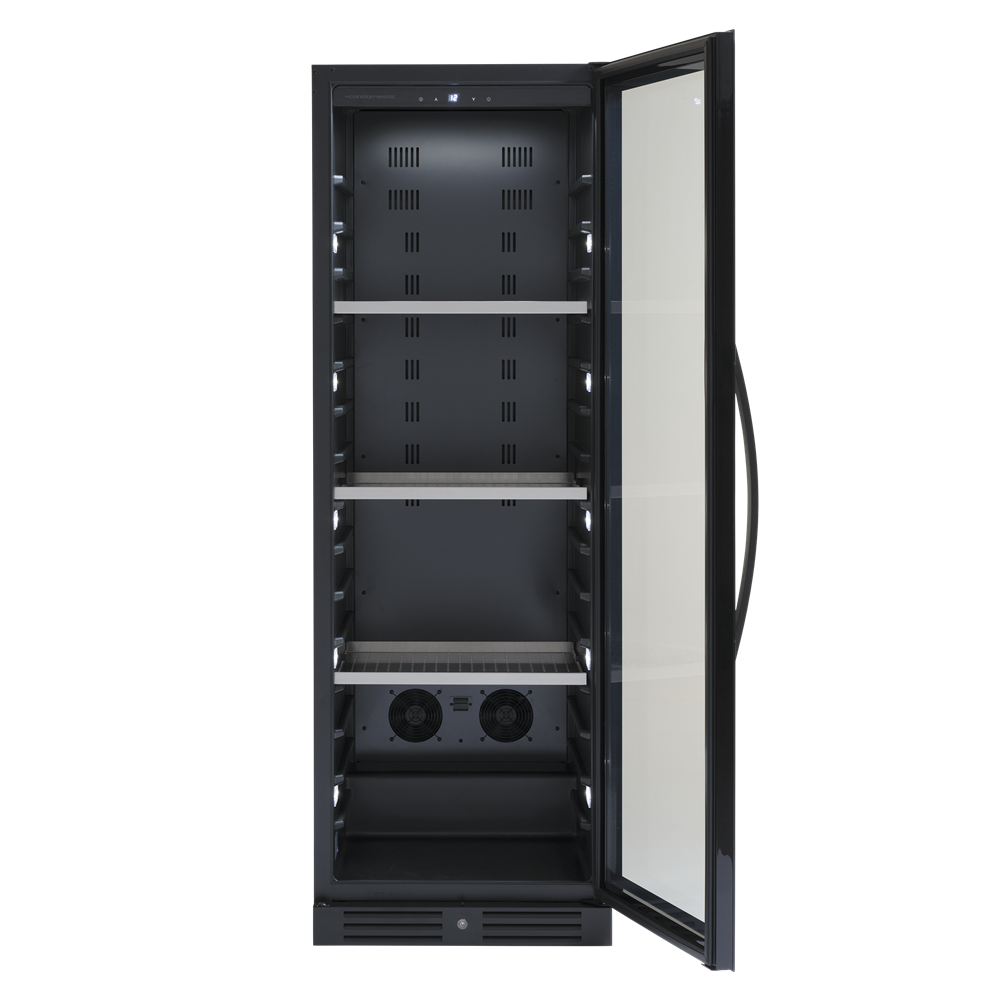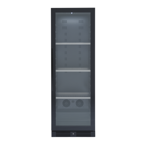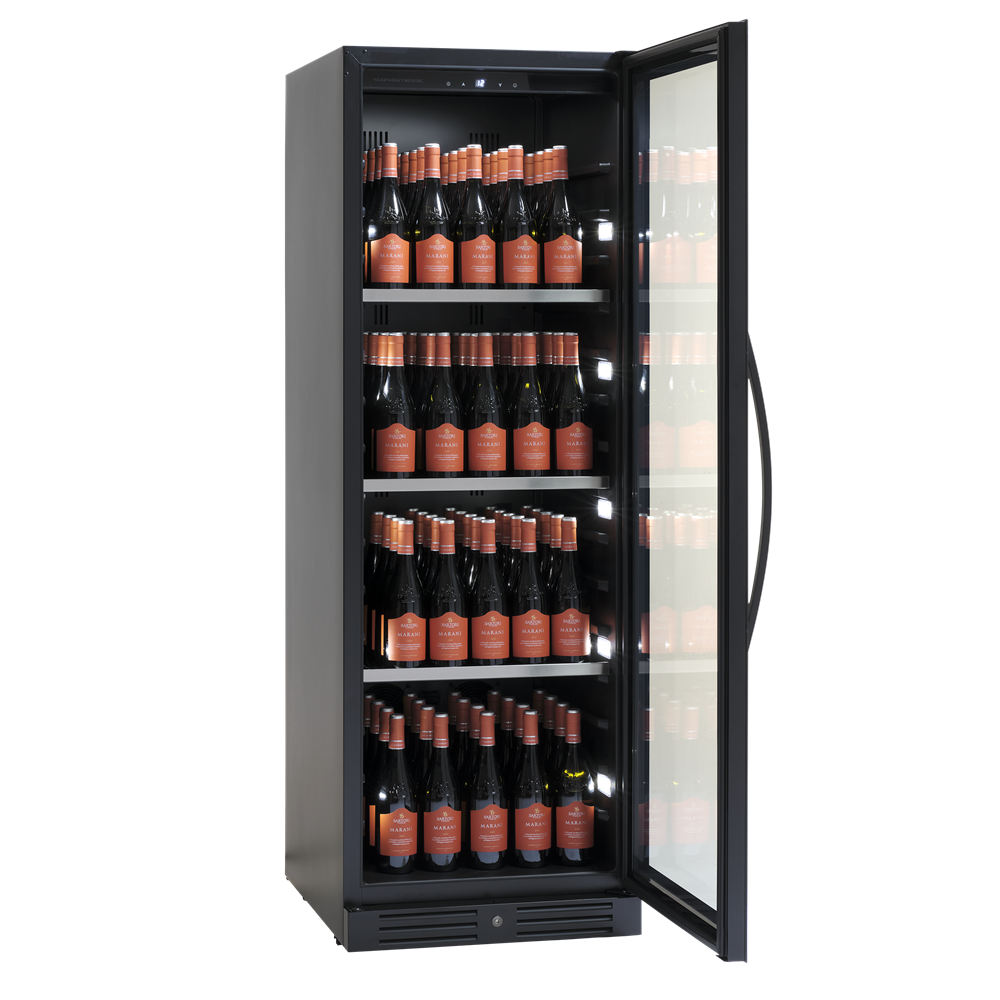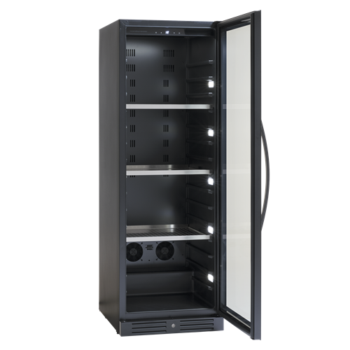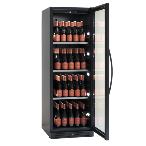 Svart serveringsskåp med exklusiv ramlös glasdörr med lås. Levereras med 3 kraftiga stålhyllor för 138 stående flaskor.