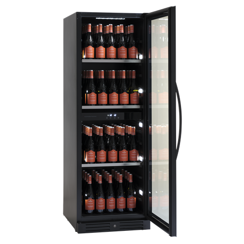 SV 1382 B kan användas som ett inbyggt eller fristående serveringsskåp. Skåpet har två zoner, kan justeras mellan 5°C - 18°C oberoende av varandra och rymmer 138 stående flaskor på 3 stålhyllor. Ett vackert skåp för att visa upp dina flaskor.