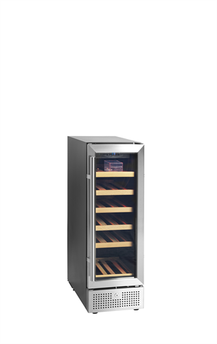 TFW-S-serien med vindisplaykylar av rostfritt stål är en modern lösning för att förvara och presentera vinflaskor. Den har en elegant design med front av rostfritt stål, svart interiör, mjuk LED-belysning och utdragbara trähyllor. Det moderna kylsystemet är ytterst effektivt och minskar kylens ljud, värme och energiförbrukning.
