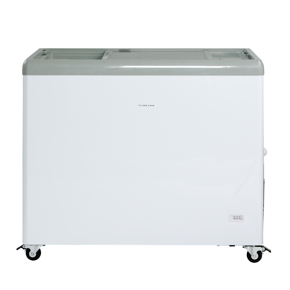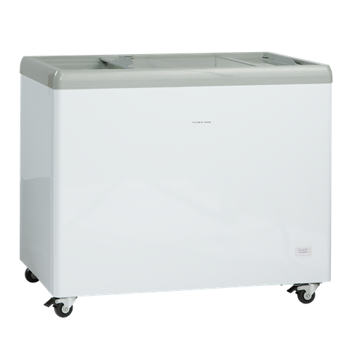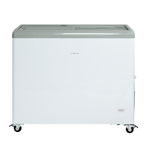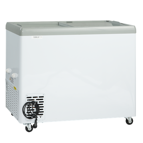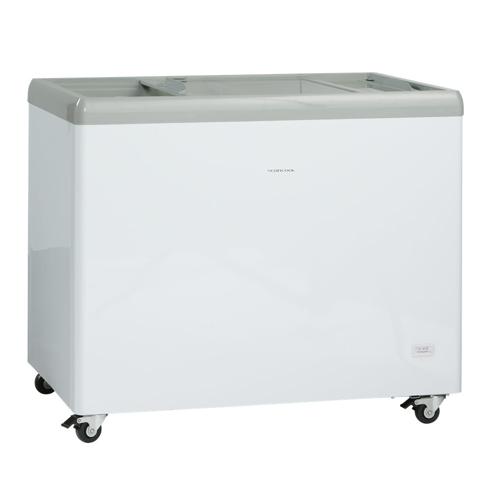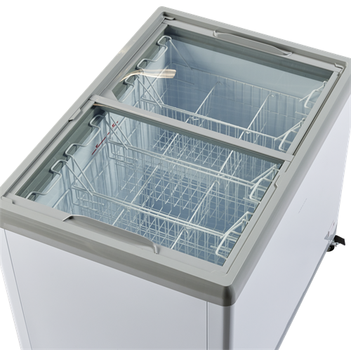 Glassfrysen levereras med platta transparenta skjutlock med integrerade handtag som håller extra kalla förhållanden.