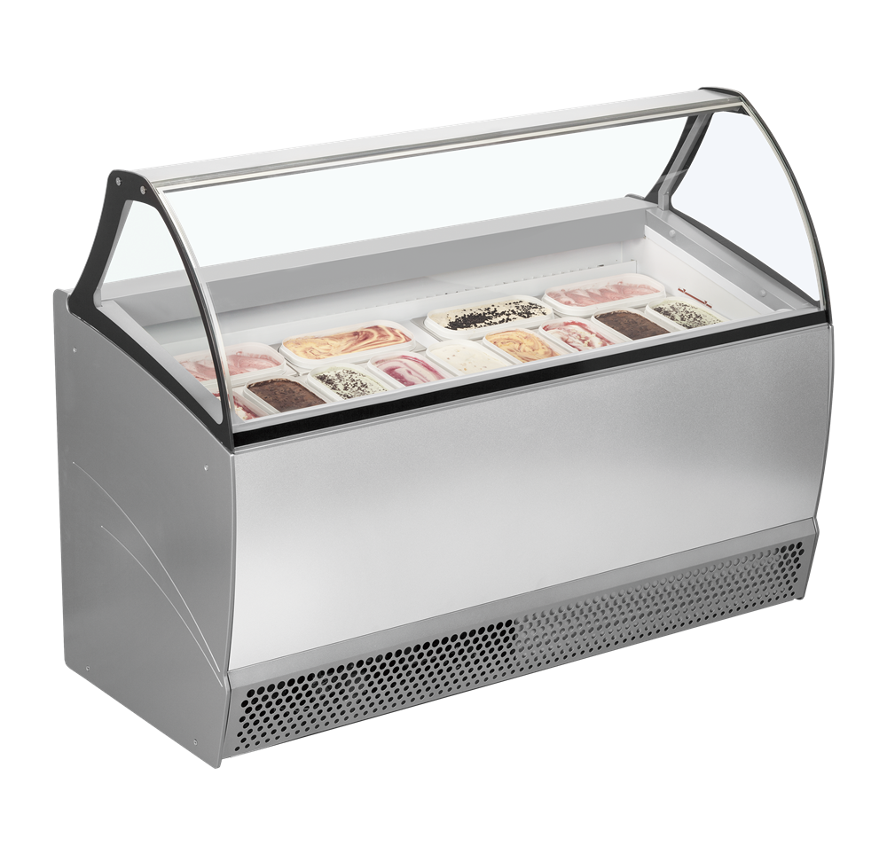 Bermuda-serien finns i två displaystorlekar, antingen 10 eller 13 plåtar. Skåpet är utrustat med ett ventilerat kylsystem som håller glassen i idealisk serveringstemperatur. Dessutom har enheten en separat kyld underförvaring. Bermudas smäckra design med välvt glas är både elegant och praktisk, med en uppvärmd yta för att motverka kondens. Med sin fantastiska kombination av kvalitet och prisvärdhet är den ett populärt val bland säljare av glass.