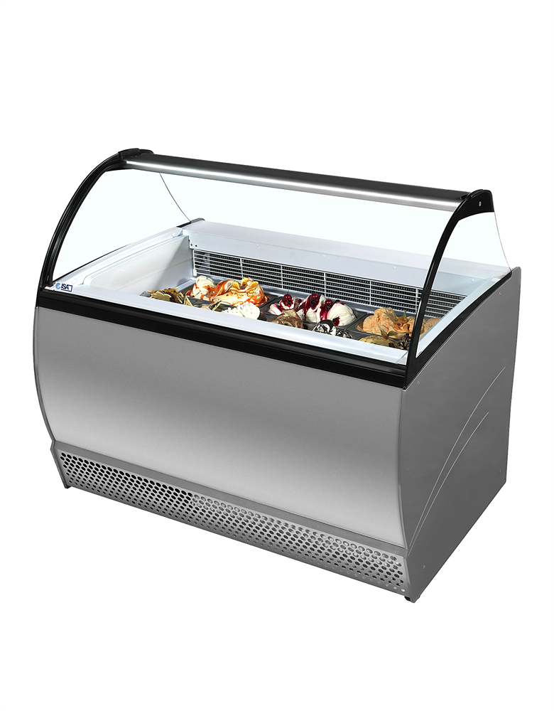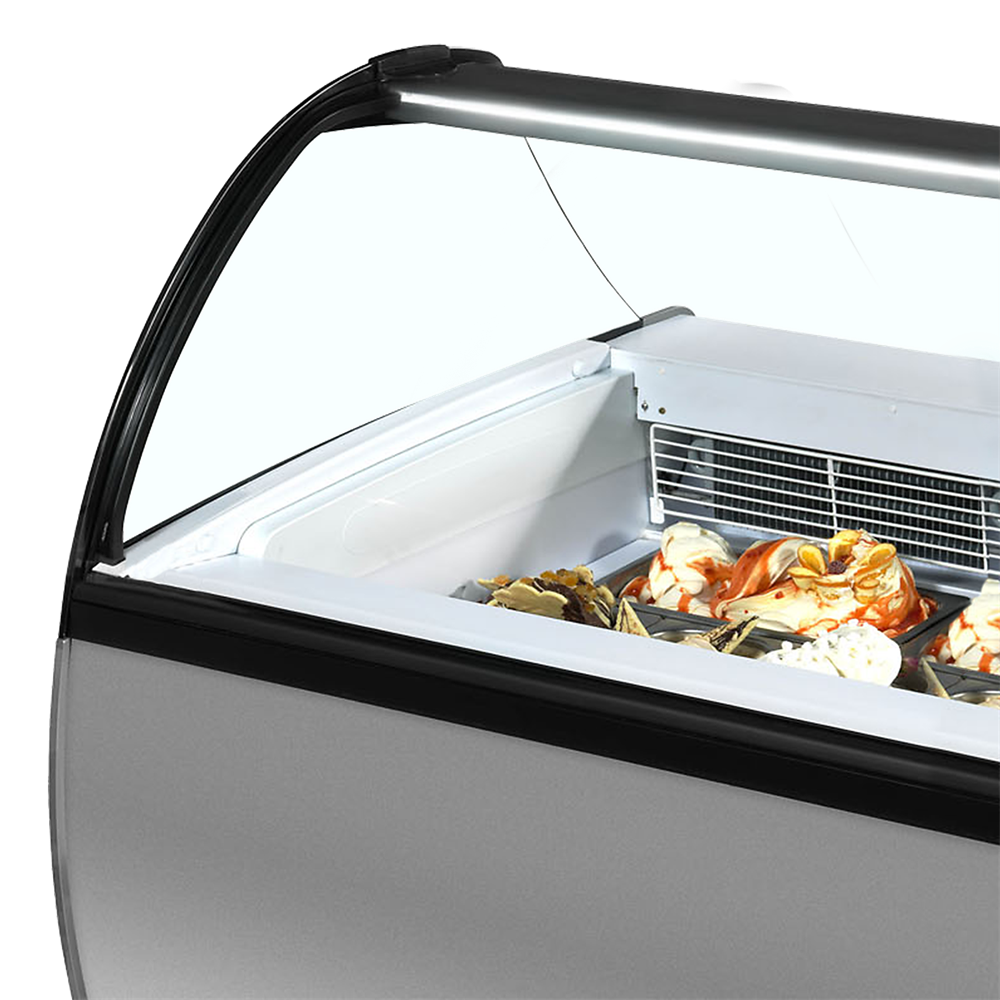 Isabella-serien är ett rymligt skåp för skopglass med varianter med 10 eller 13 plåtar. Designen med välvt glas skapar en häftig display som garanterat drar kundernas uppmärksamhet till sig, och den bakre serveringshyllan möjliggör snabb servering. Med inbyggd kyld underförvaring kan du enkelt fylla på displayen med ny glass under hektiska dagar. Dessutom är skåpet försett med svänghjul för enkel rörlighet och LED-innerbelysning så att glassen belyses på bästa sätt.