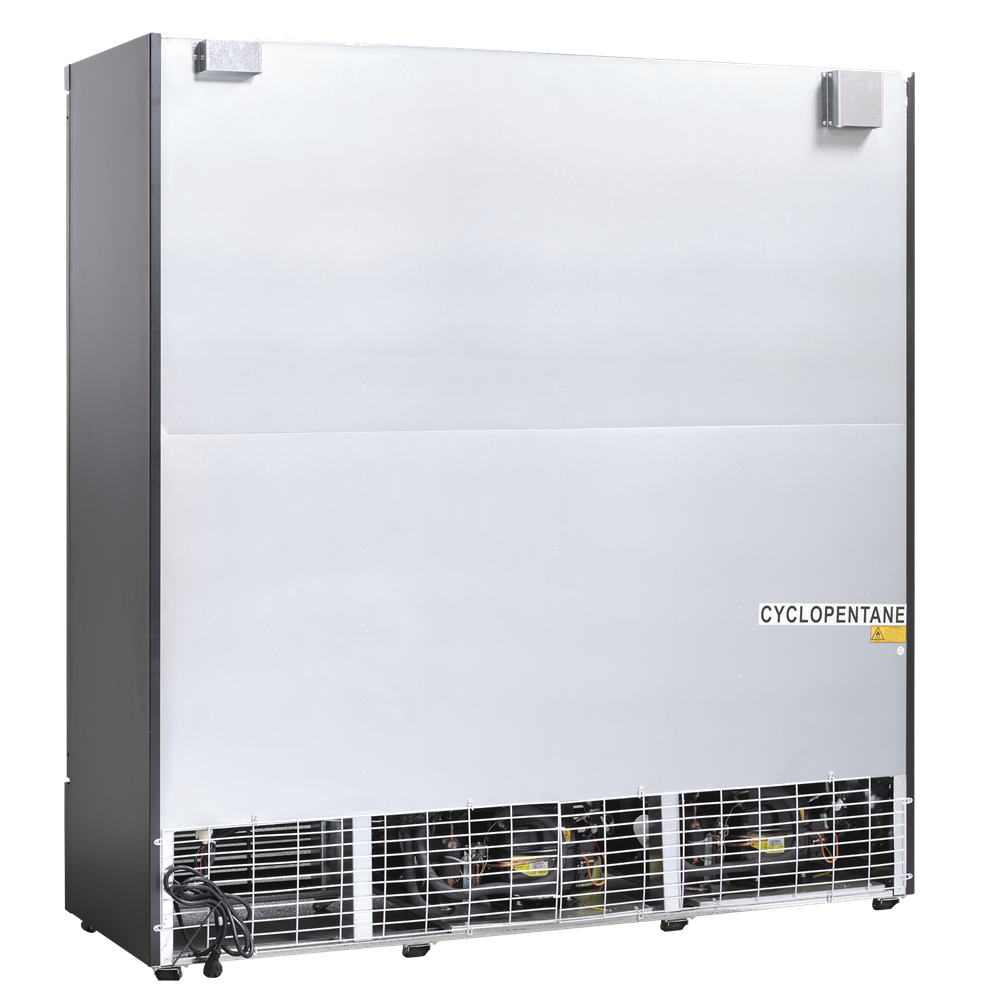 Levereras med 15 svarta, starka trådhyllor med gängor som gör att alla typer av produkter står stabilt på hyllorna. Hyllplanen kan justeras i många nivåer. Skåpet har 8 kraftiga hjul, varav 2 med broms, så att det alltid går att flytta, även när det är fullt. Skåpet har gångjärnsdörrar med lås, så det är möjligt att låsa skåpet. Dörrarna stängs automatiskt, vilket alltid minimerar temperaturhöjningar.