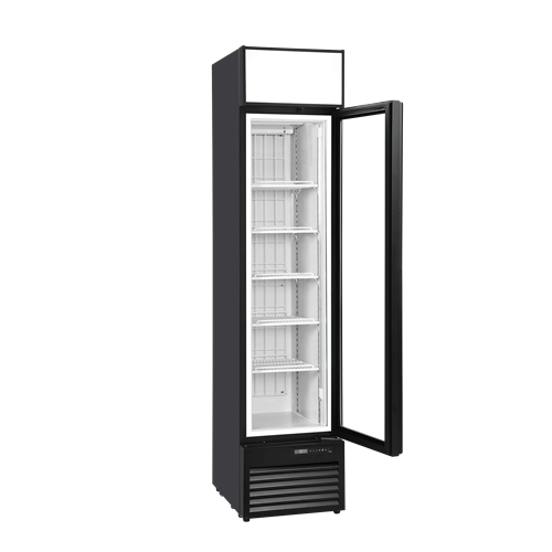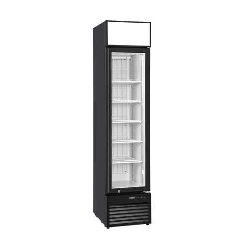 Den stilrena designen med svart aluminiumdörr och integrerat handtag ger ett professionellt och modernt utseende. Kylaren passar enkelt in i försäljningsytor där både utrymme, funktionalitet och ett snyggt utseende är viktigt.