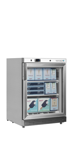 UF-SG-serien med frysar är versionen i rostfritt stål med glasdörr av våra UF-skåp. Dessa displayfrysar erbjuder hög kvalitet och tillförlitlighet till ett konkurrenskraftigt pris. De finns i olika storlekar och har samtliga en stilren design i rostfritt stål. Standardfrysskåpet levereras med fasta fryshyllor som bidrar till att säkerställa en jämn temperatur i hela skåpet. Du ställer in temperaturen på den lättanvända digitala termostatdisplayen.