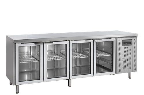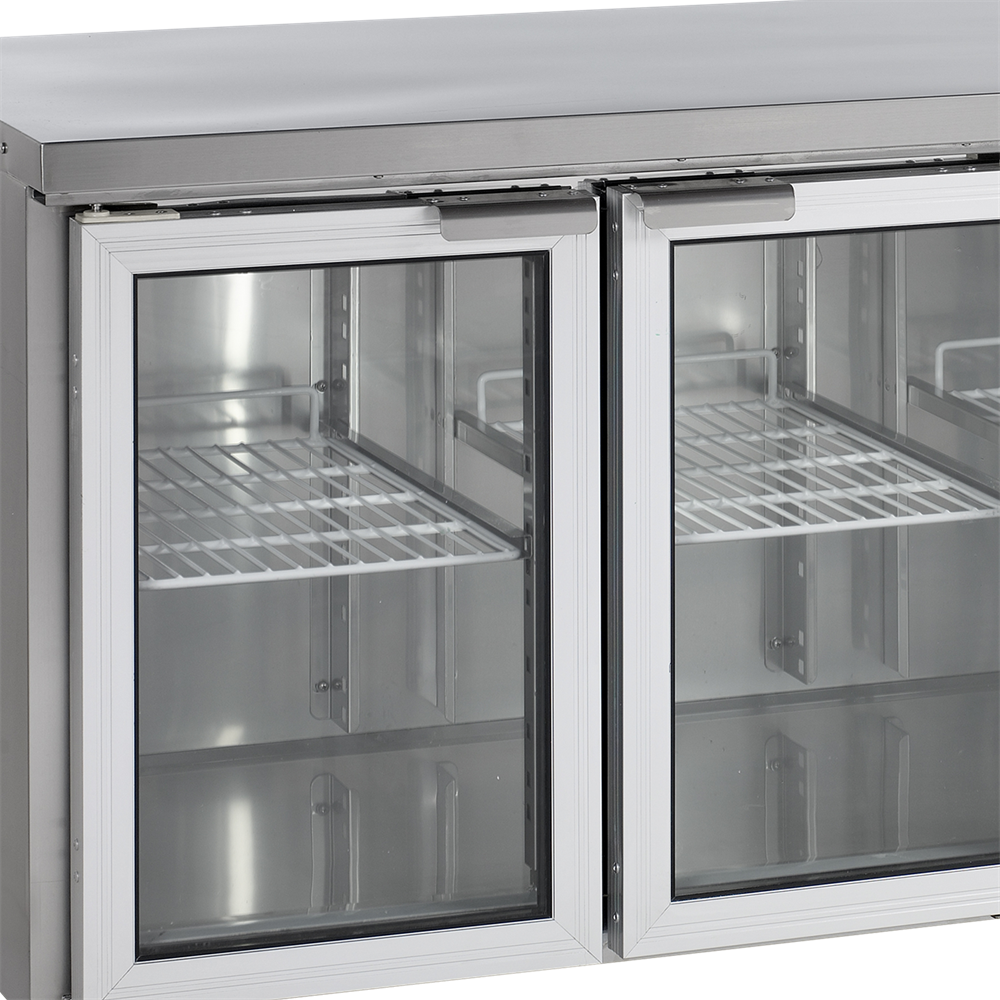Ny design|Rostfritt stål|Automatisk avfrostning|Självstängande glasdörrar|Avtagbar bordsskiva|Ställbara ben|Ventilerad kylning