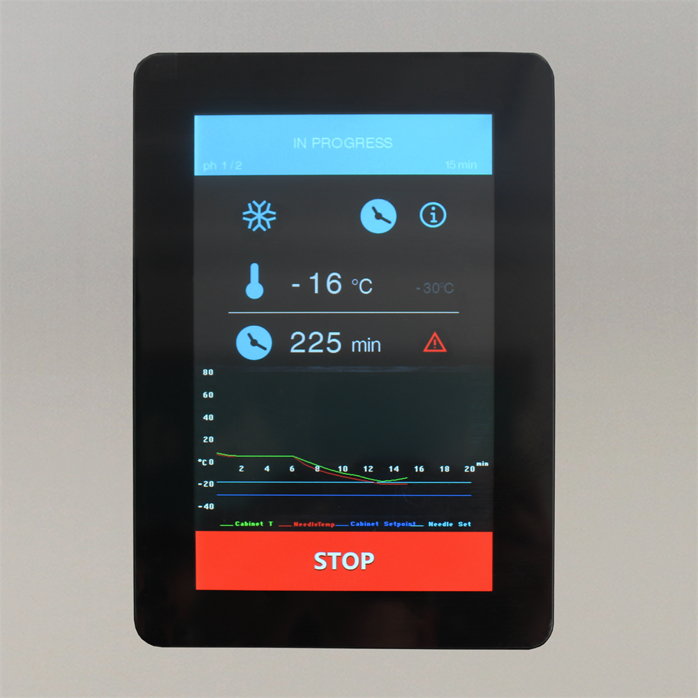 Styrenhet med pekskärm|Programmerbar termostat|HACCP-kompatibel dataexport|Ladda upp eller ner data via USB|Uppstyrningar för GN1/1 och Euronorm|Rostfritt stål|Sensor för innertemperatur ingår|Vändbar självstängande dörr|Ställbara ben|(Kyl +70 °C till +3 °C) 55 kg på 90 minuter|(Frys +70 °C till -18 °C) 38 kg på 240 minuter|Spänning / Frekvens: 380-400/50 V/Hz