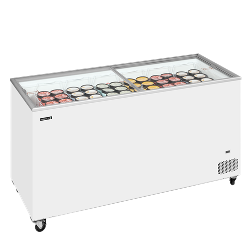 IC-standardserien med glassfrysar innehåller stabila och välbyggda enheter till ett konkurrenskraftigt pris. De är ett utmärkt alternativ för t.ex. nystartade företag och säsongsförsäljning. De är försedda med platta skjutlock av glas så att produkterna syns och en hel uppsättning korgar som kan fyllas med god kulglass och pinnglass. Enheten kan enkelt flyttas tack vare tåliga svänghjul för tung drift.