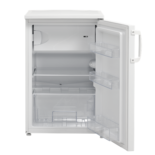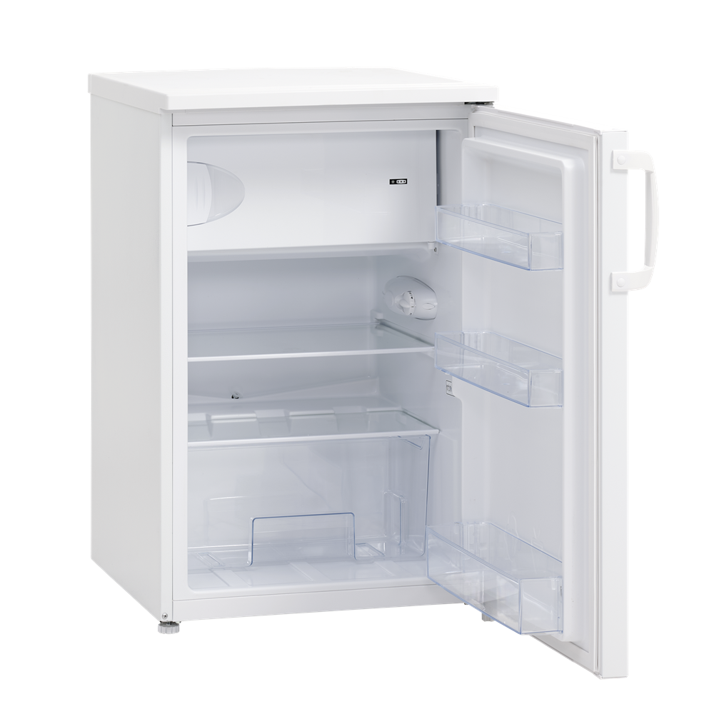 Energisnålt litet kylskåp med inre 4-stjärnigt frysfack. Kylskåpet har hyllor i säkerhetsglas som lätt kan torkas av och en stor grönsakslåda. Toppskivan på skåpet gör att du har extra arbetsyta till hands. Temperaturen ställs in på termostaten som finns på skåpets övre del. Den platta dörren har ett bra handtag för enkel öppning. Automatisk avfrostning i kylfacket. Säkerhetsglaset är extra starkt för att klara vardagens utmaningar. Dörren är gångjärn på höger sida vid leverans, men kan vändas om man vill